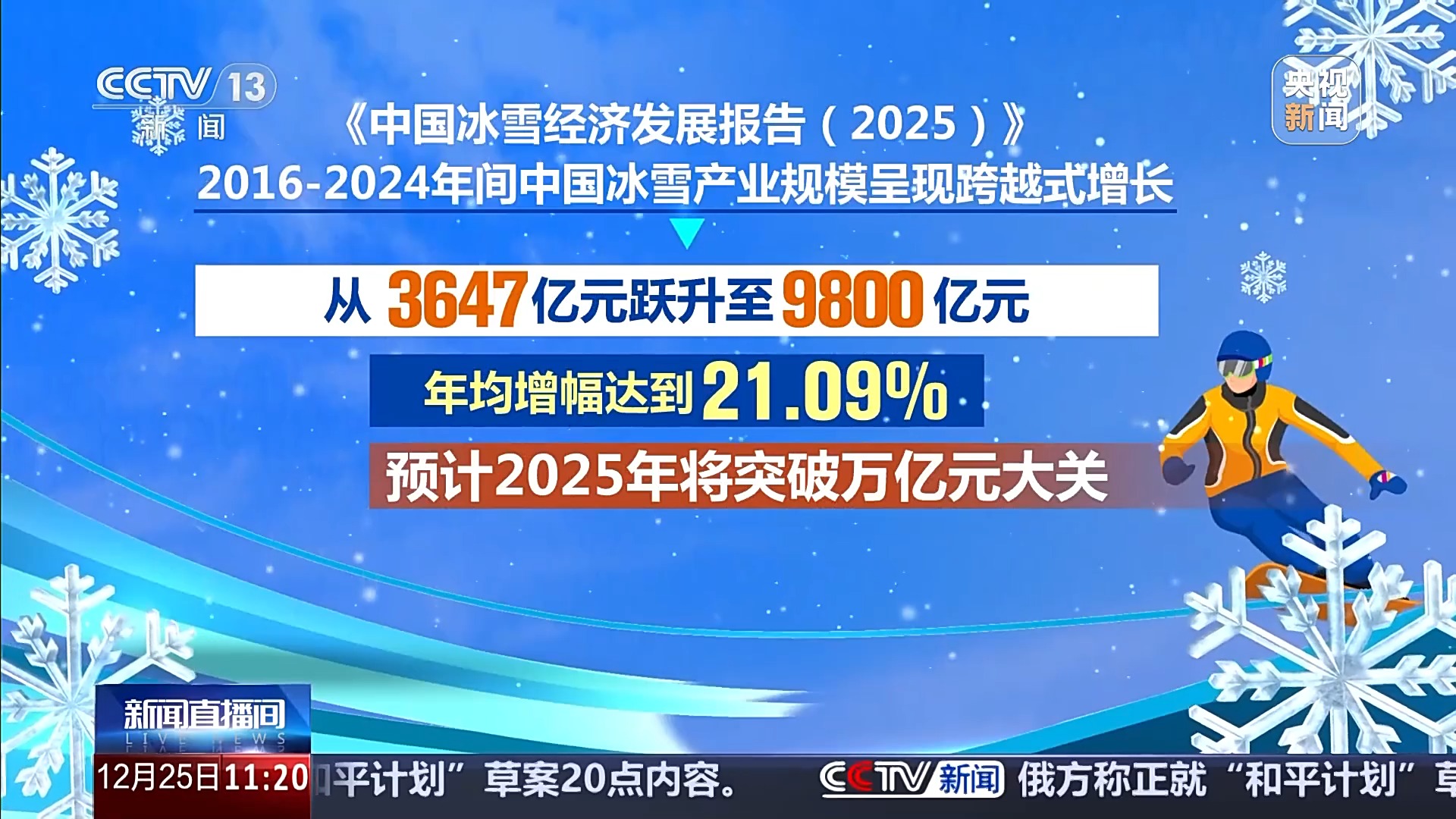 《中国冰雪经济发展报告(2025)》显示,2016年至2024年,中国冰雪产业规模快速增长,从3647亿元跃升至9800亿元,h年均增长率达21.09%,预计2020年将突破人民币。